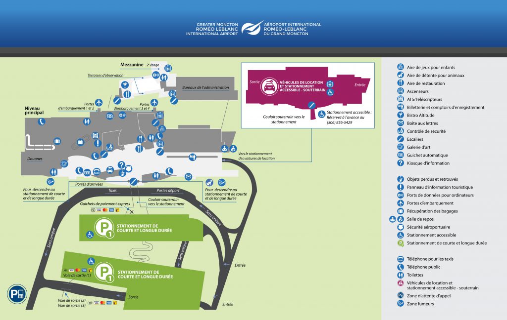 Des places de stationnement accessibles supplémentaires sont disponibles à l’intérieur dans le stationnement souterrain, mais elles doivent être réservées à l’avance et nécessitent un permis d’accès. Le coût de l’un de ces espaces intérieurs est de 125 $ par semaine. Si vous avez besoin d’aide avec le stationnement accessible ou si vous souhaitez réserver l’un des espaces souterrains, veuillez communiquer avec le bureau de l’administration de l’aéroport au (506) 856-5444, poste 6 (du lundi au vendredi, sauf les jours fériés) ou par courriel à admin@cyqm.ca.