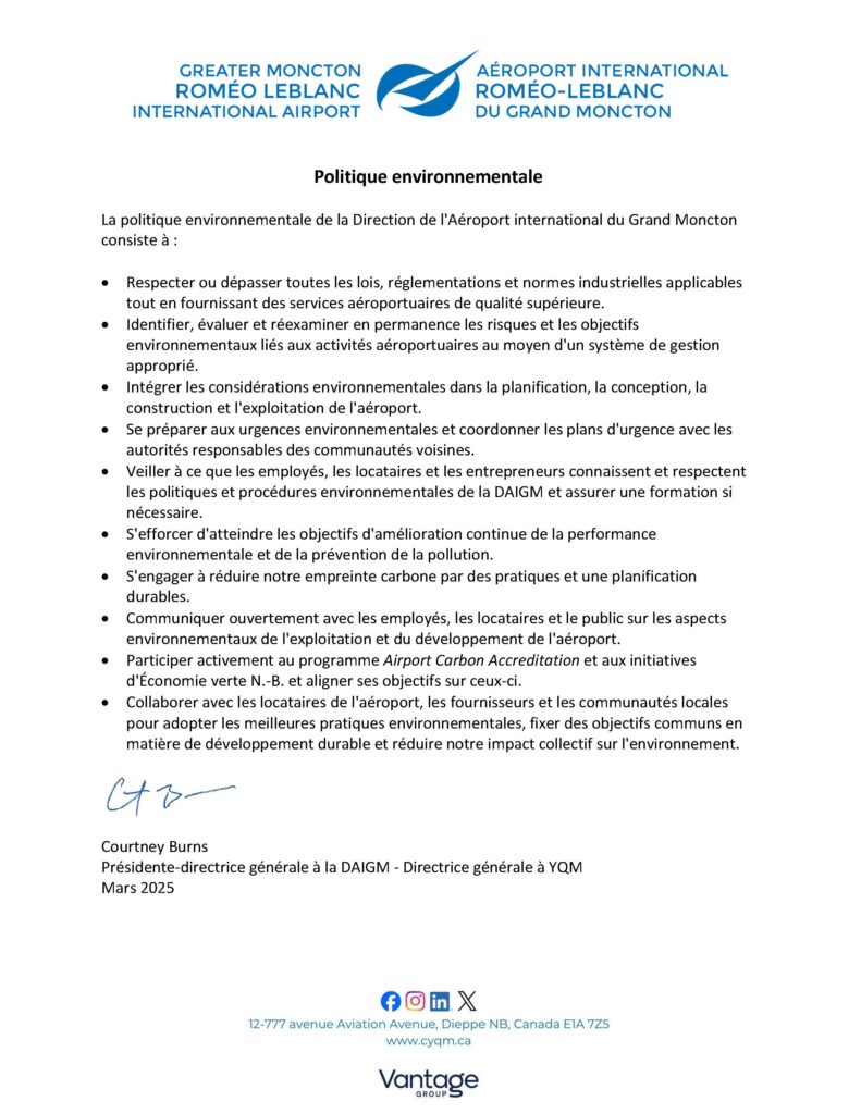 À l’Aéroport international Roméo-LeBlanc du Grand Moncton (YQM), nous veillons à protéger l’environnement en réduisant l’impact possible de nos activités. Ainsi, nous mettons en place des politiques et des procédures qui deviennent partie intégrante de notre culture. YQM s’attache non seulement à respecter la réglementation fédérale en matière d’environnement, mais également à dépasser les exigences et normes applicables en la matière grâce à un système de gestion environnementale fondé sur la norme ISO 14001. Nous avons donc pris l’engagement d’améliorer continuellement notre performance environnementale.
