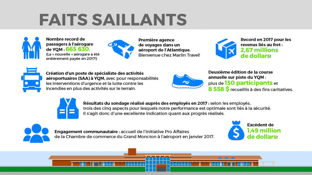 YQM s’efforce de plus à maximiser sa contribution au développement économique et communautaire local et régional. Son activité économique annuelle représente actuellement plus de 665 millions de dollars, ce qui en fait l’un des plus importants acteurs du secteur privé au sein de l’économie du Nouveau-Brunswick. YQM est membre du Vantage Airport Group.